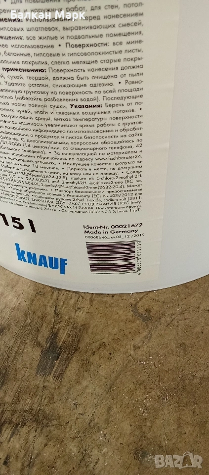 Продавам дълбокопроникващ грунд Knauf TIEFENGRUND, предназначен за хигроскопични основи.