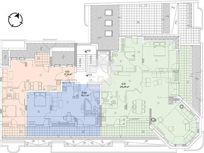 Апартамент номер 42-А се намира на седми жилищен етаж и се състои от просторно входно антре, баня с тоалетна, всекидневна с кухненски бокс и трапезария, спалня и тераса.
