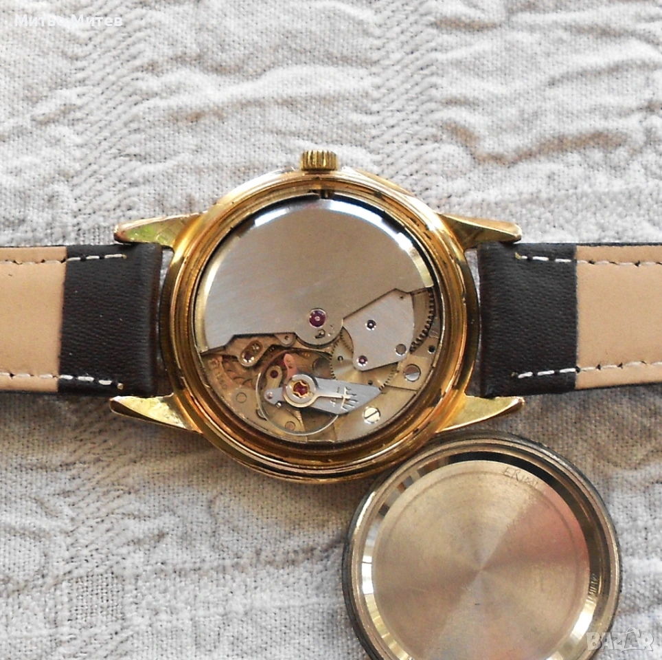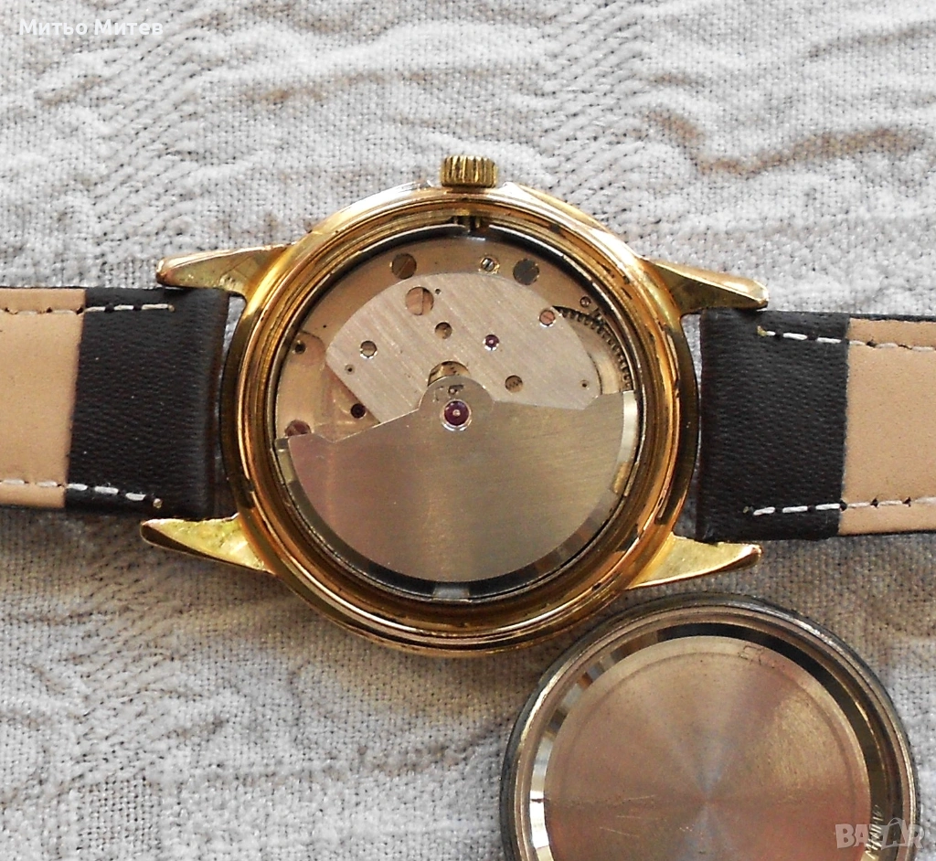 Позлатената 34 мм. каса е добре запазена, с видимо износване на долния ръб в зоната около коронката.