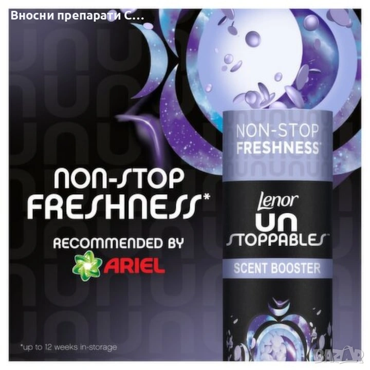 Придава нежна мекота и аромат на парфюм . Удължаващите аромата перли се добавят към барабана , така аромата на омекотителя е по – силен , защото е в контакт с прането от самото начало. Любимият омекотител LENOR , е с до 12 седмици свежест . Начин на приложение : 1. Напълнете дозатора до маркитовката (47мл) 2. Сложете кристалите в барабана при прането или заедно с праха в отделението за прах . Lenor Unstoppables Perfume е изключително дълготрайна свежест за вашето пране. Подходяща е за всякакъв текстил, включително спортно облекло, вълна и коприна. Перлите за пране се поставят директно в барабана, така че ароматите да могат да проникнат във влакната през целия цикъл на пране - за дълготраен свеж аромат от Lenor. Изключително дълготрайна свежест за пране
