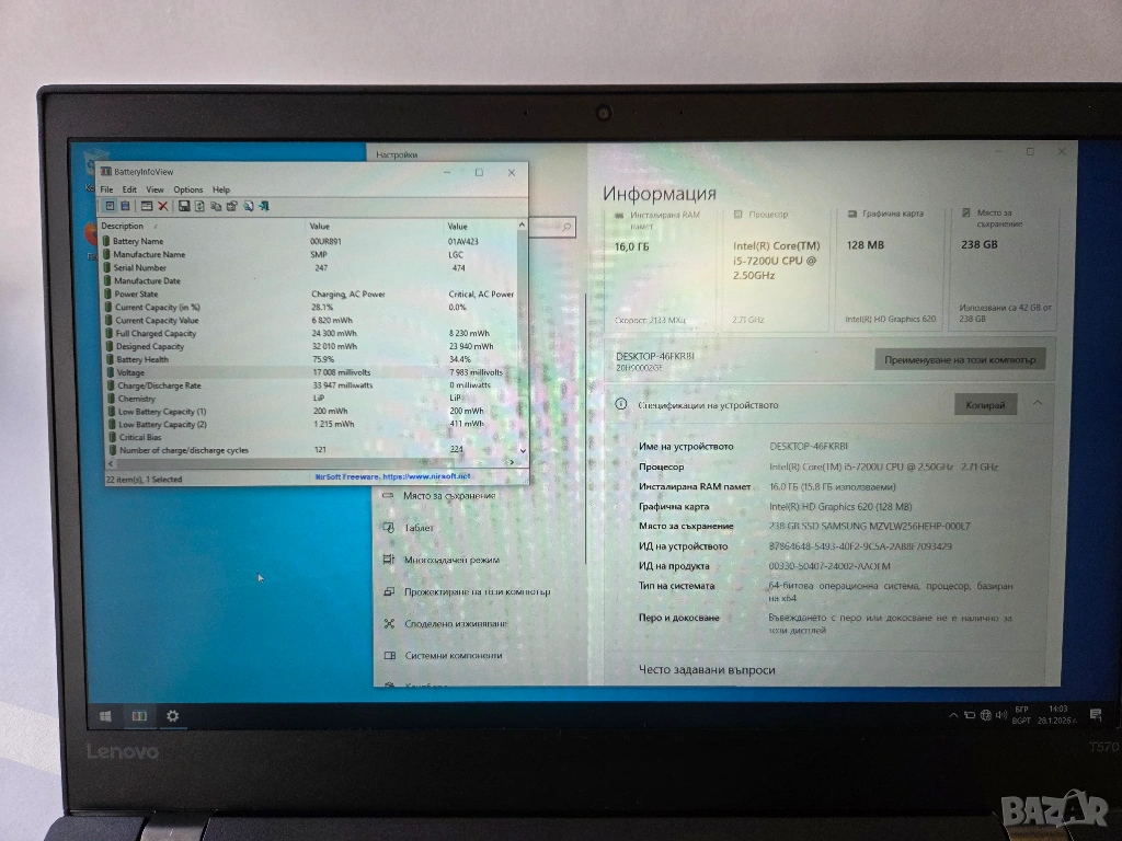 Лаптоп Lenovo ThinkPAD T570 - i5-7200U - 16 GB DDR4 - 256 GB SSD → Обява 53257927