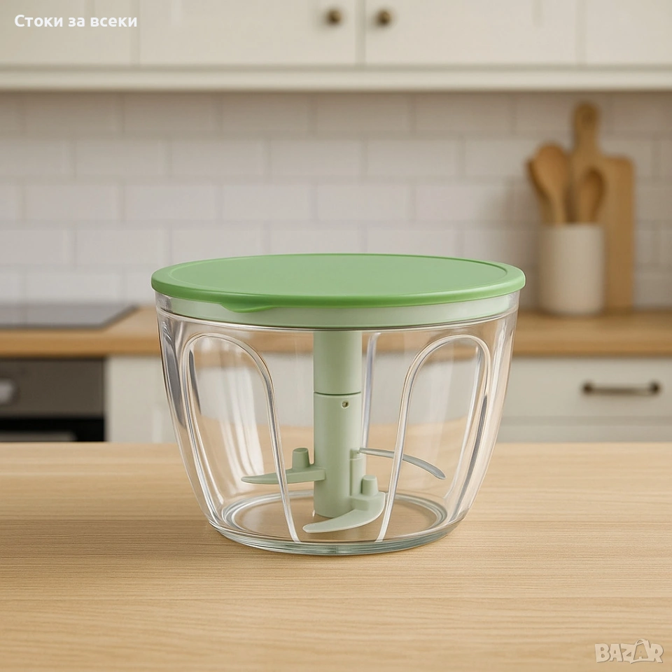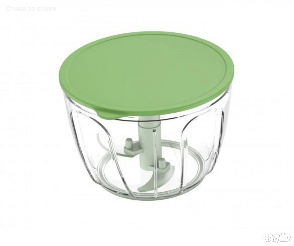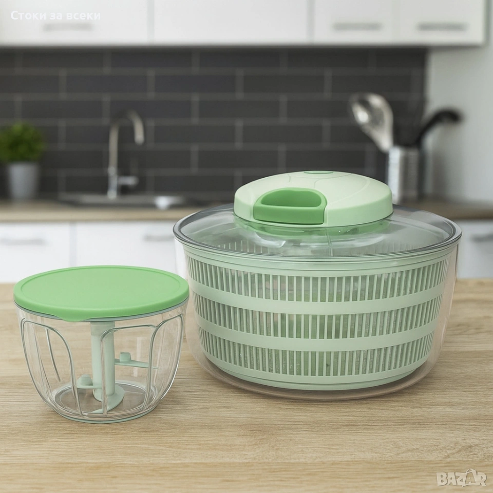 Размери: Центрофугата за салата: Ø24.5х15.5см – 4л; Ръчен чопър: Ø14х9см – 650мл; Материал: Неръждаема стомана, PS, PP, HDPE, TPR, ABS; Комплектът съдържа: Купа - 4 литра, кошница, капак, капак с въже, чопър купа антислип дъно ≈0.65л., чопър капак за съхранение, приставка за рязане с 3 ножа от неръждаема стомана; Система за издърпване за активиране на функциите за центрофугиране и нарязване. Енергийно ефективен уред за сушене и нарязване на съставки по време на приготвяне на храна. Остриетата са изключително остри – бъдете внимателни и дръжте далеч от деца. Приставката с ножове може да се използва за рязане на плодове, зеленчуци, подправки, ядки, бисквити и др. Неплъзгащото се краче трябва да се отстранява при миене в съдомиялна машина. Цвят: Зелен.