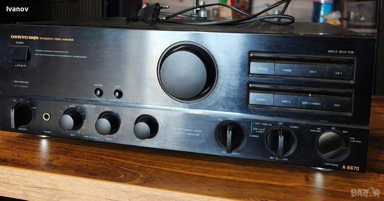 Onkyo Integra A-8670 е висококласен интегриран стерео усилвател от края на 80-те години, произведен в Япония, с мощност около 105 W на канал при 8 ома, широк честотен обхват 2 Hz – 50 kHz, много ниски изкривявания (0.008%) и висок damping factor 150, което осигурява отличен контрол над говорителите; разполага с Phono вход за MM и MC дози, както и стандартни line входове (CD, Tuner, Tape, Aux), стабилна работа с колони от 4 ома нагоре, масивна конструкция и тегло около 13.5 кг, което го прави много подходящ за сериозна Hi-Fi система с качествен и детайлен звук. Усилвателят е от личната ми колекция, един от малкото които реших да си оставя за слушане, но за съжаление вече няма да ми бъде потребен, понеже нямам къде да го слушам и не се връзва с обстановката на новото жилище, съответно се наложи да премина на саундбар домашно кино. Та усилвателя е без ремонти и до последно си работеше перфектно, мога да предложа тест на място за гр. Варна или Русе след предварителна уговорка и за предпочитане е лично предаване, но мога да го пусна и по куриер след капаро в размер на доставките! За продажба са ми и озвучителните тела- чифт големи подови тонколони Infinity Delta 50, както и ресивър