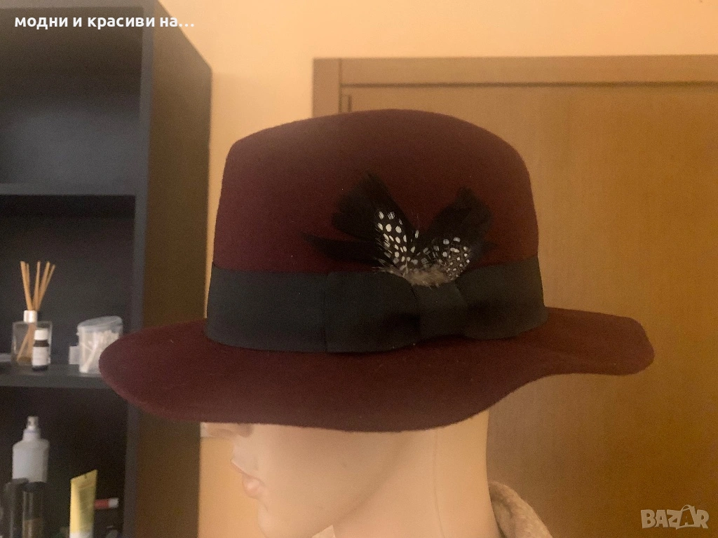 1.Първата шапка е в прекрасния дълбок тон на бордото. Много изискана и ефектна. Детайлът с птичи пера я прави още по- уникална и открояваща се. В съчетание с подходящи дрехи в подобна тоналност като например връхна дреха в сиво, бежово,златисто розово, зелено би придала завършен и съвършен вид.