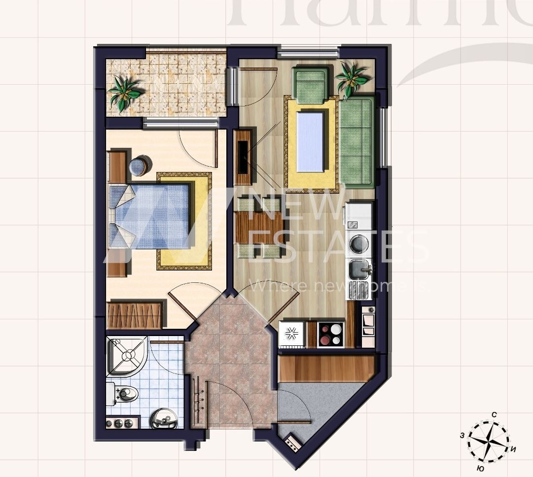 Жилището е с чиста застроена площ от 49.51 кв.м и обща площ 60.60 кв.м, с практично и удобно разпределение: светла дневна с кухненски бокс, самостоятелна спалня, баня с тоалетна, килер и тераса.