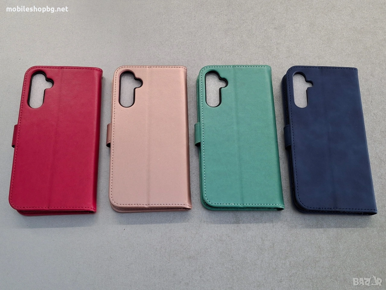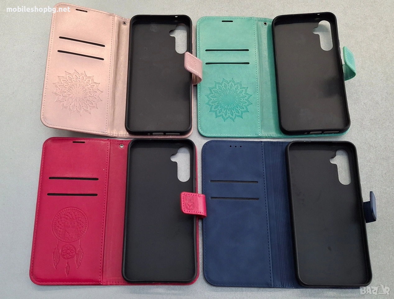 Калъф за Samsung Galaxy A54. Отваря се странично, има прегради за карти или визитки. Розов, маджента, зелен, син. Цената е за един брой.