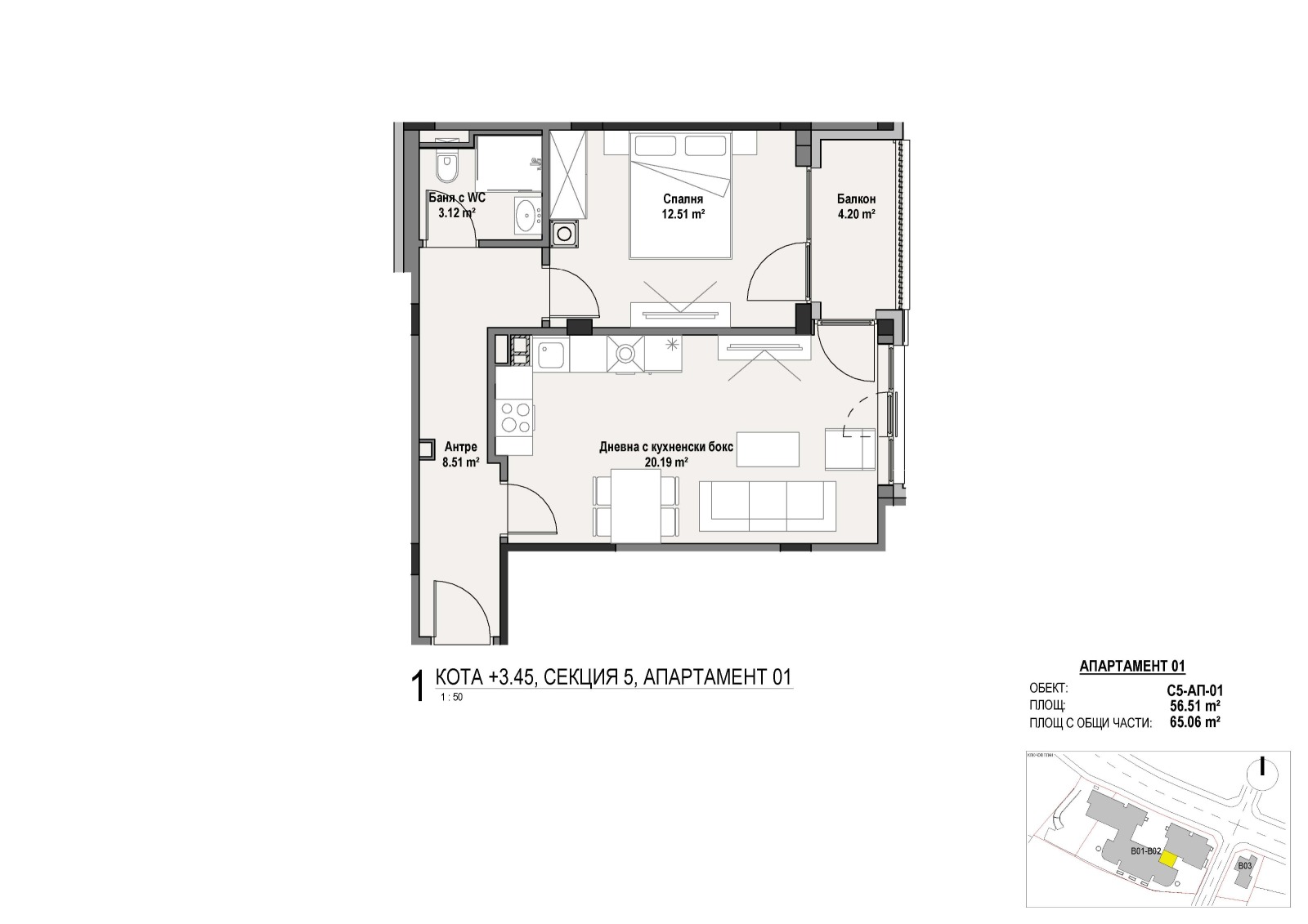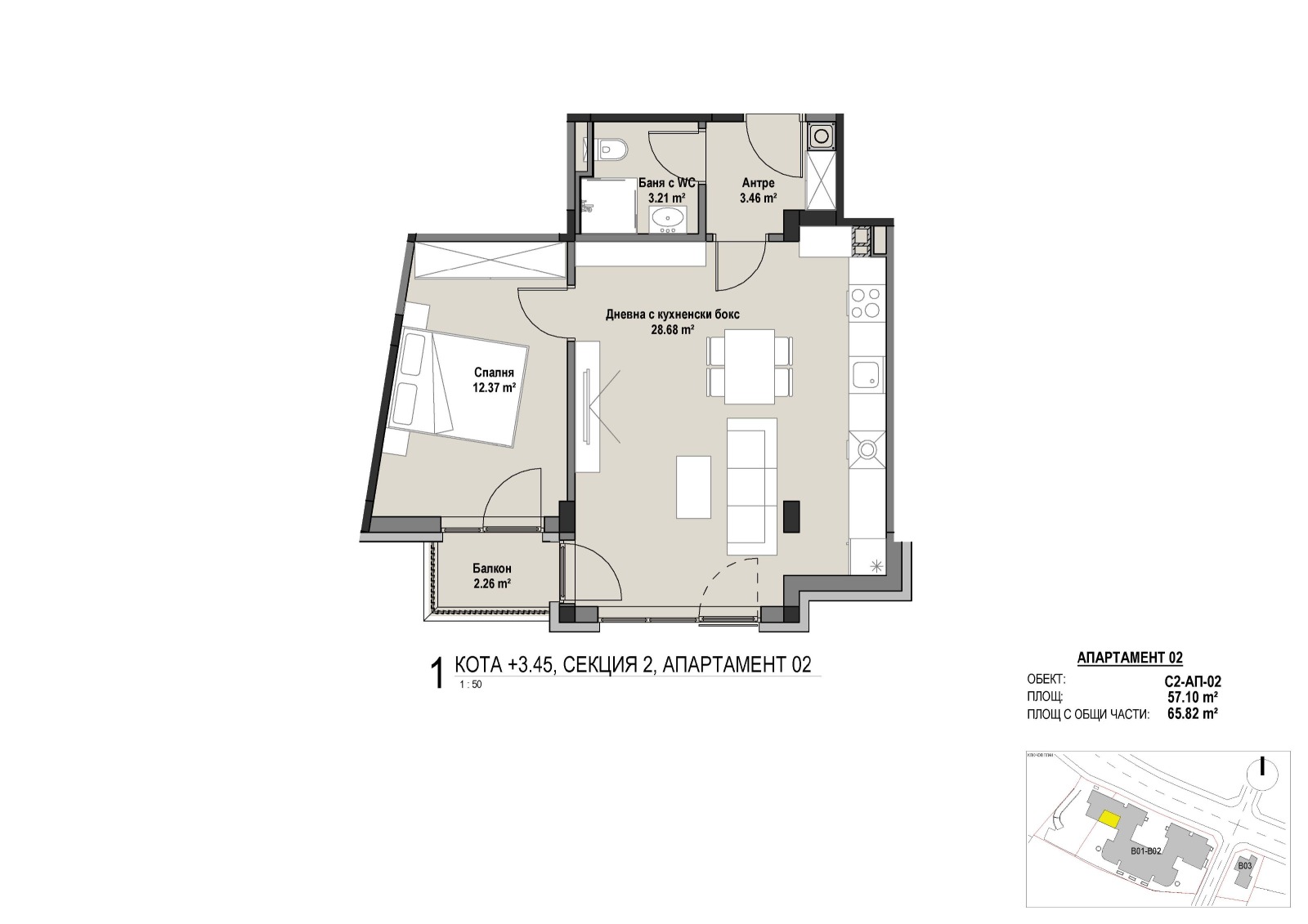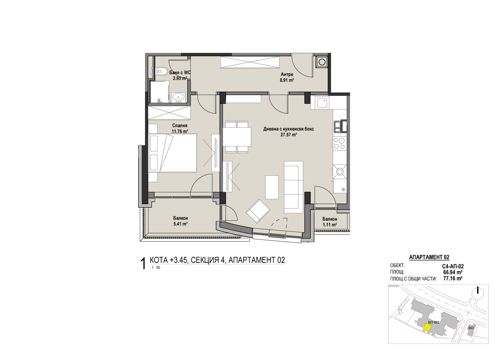 - Квадратура на двустайни апартаменти: от 54,67 кв.м до 95,18 кв.м с общи части