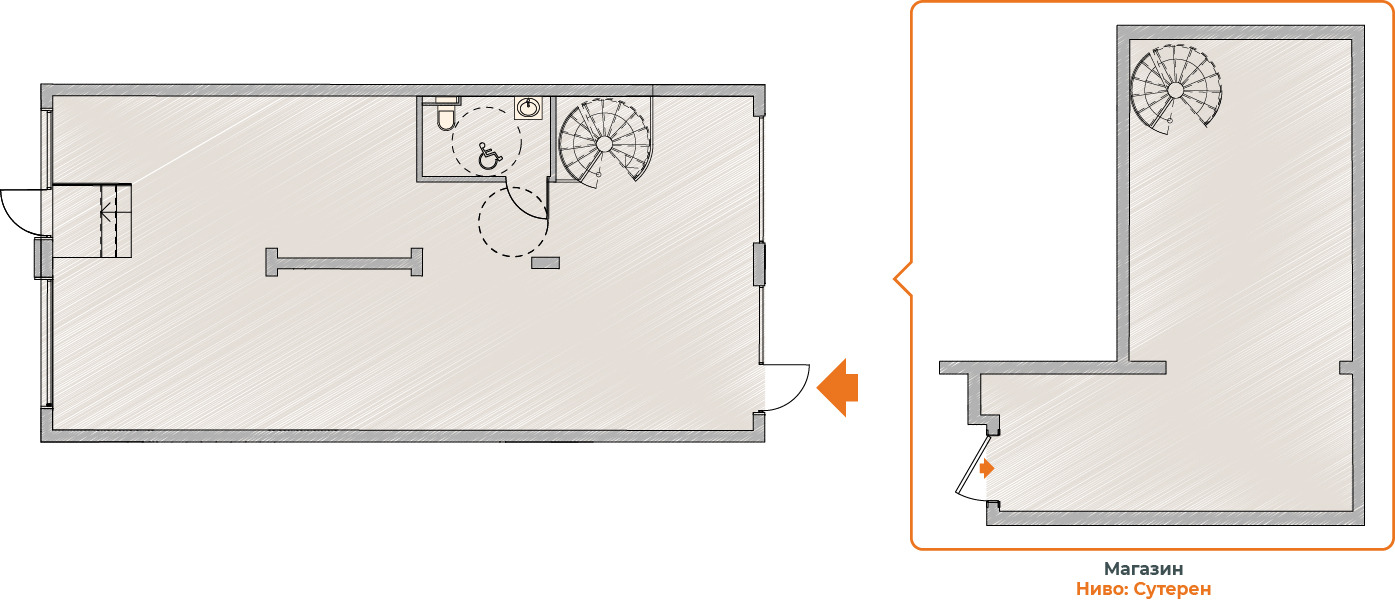 Две помещения Партер 149,85м2, сутерен 57,21м2, двор пред магазина 23,03м2, Двоен гараж със склад в сутерена 79,84м2