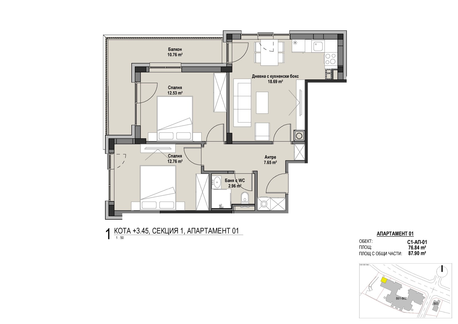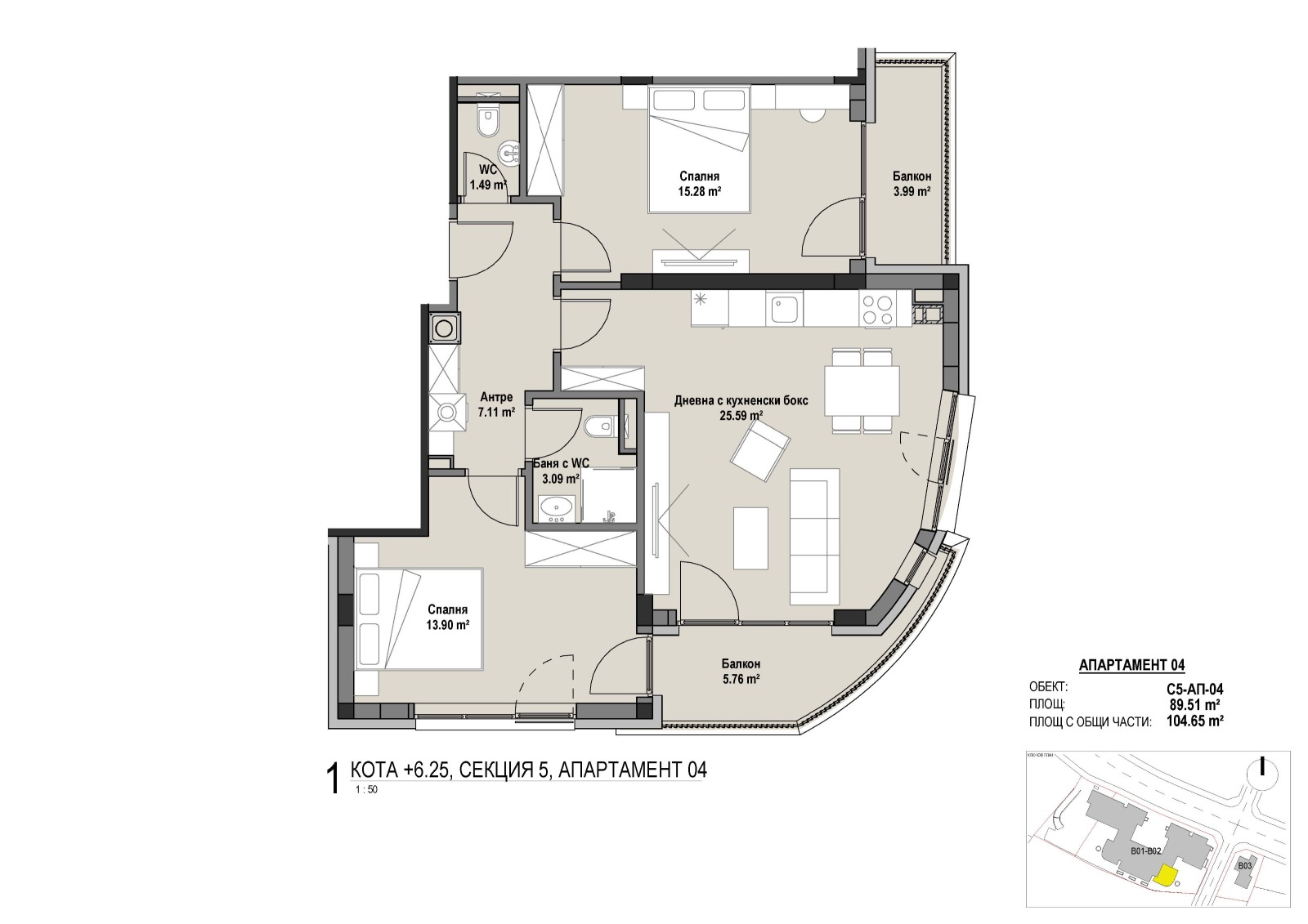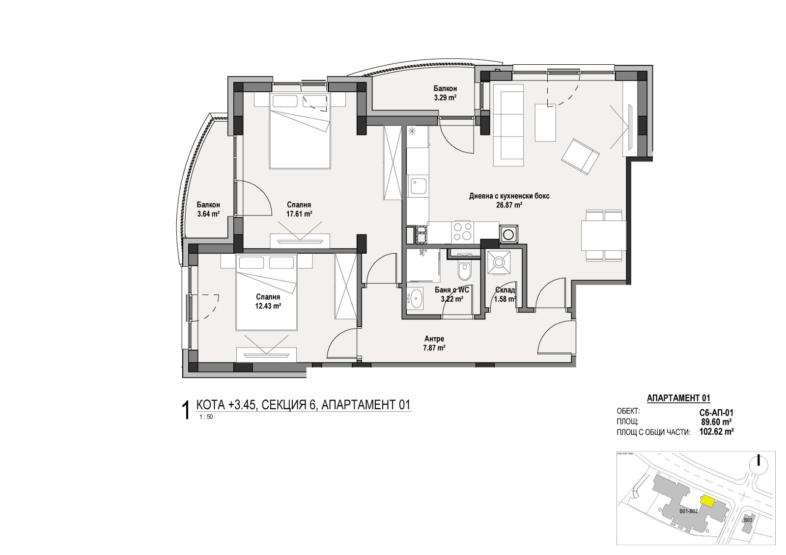 - Квадратура на тристайни апартаменти: от 87,90 кв.м до 124,42 кв.м с общи части