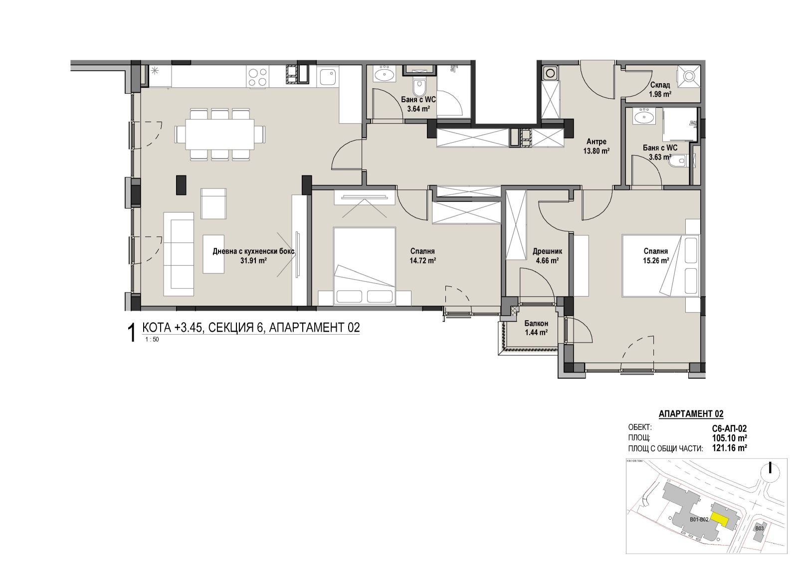 Апартаментите се състоят от антре, дневна с кухненски бокс, две спални, баня с тоалетна и тераса.