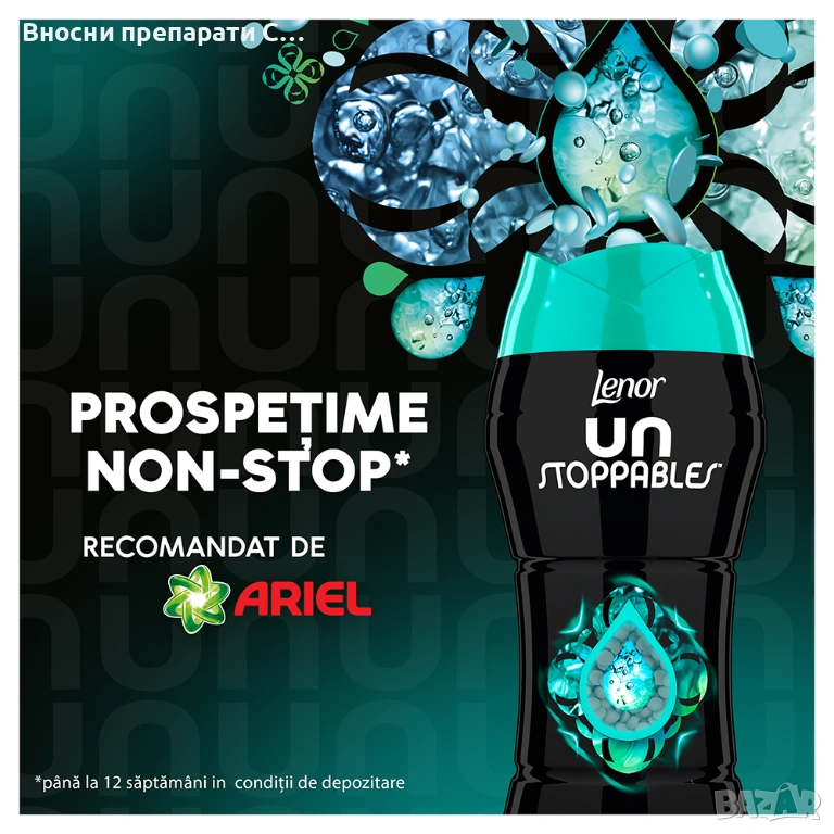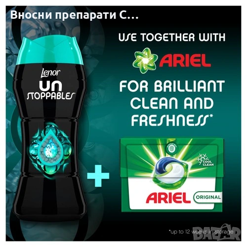 Открийте перлите Lenor Unstoppables Fresh, които се активират по време на пране, формулирани с технология за дълготрайна свежест, за да придадат на прането допълнителна доза непрекъсната свежест до 12 седмици, при определени условия на съхранение. Експертите по аромати на Lenor препоръчват Unstoppables Fresh, ако търсите освежаващ аромат на прясно изпрано пране за по-дълго време. Ароматът Lenor Unstoppables осигурява свежест с всяко измиване! Ариел препоръчва да ги добавяте към всяко пране, в допълнение към обичайната ви рутина за пране.