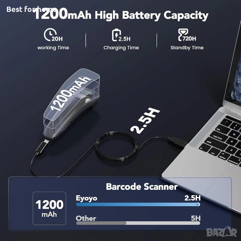 Безпроблемно сканиране с 1200mAh: Eyoyo е производителят на LCD дисплей с индикатор за нивото на батерията на преносимия мини баркод скенер, така че не е нужно да гадаете дали е необходимо да го зареждате или не. Големият капацитет на батерията ви позволява да работите непрекъснато над 20 часа, като зареждането през USB-C порт отнема само 2,5 часа, което ви позволява да се наслаждавате на по-стабилна и дълготрайна работа без притеснения. Ако сканирате само 5000 баркода на ден, скенерът може да се използва 20 дни.