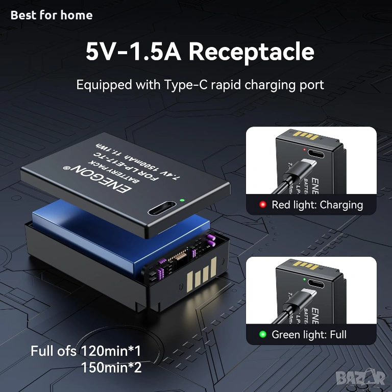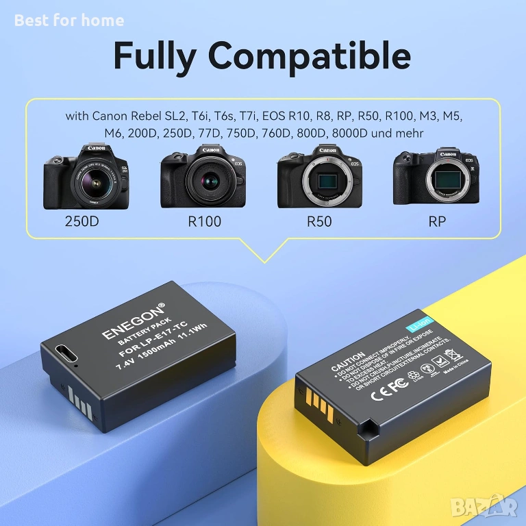 Батерия ENEGON LP-E17 с порт за зареждане тип C 1500mAh за Canon EOS R8, R10, R50, RP, R100; Rebel SL3, SL2; T8i, T7i, T6i, T6s; EOS M3, M5, M6; EOS 200D, 250D, 77D, 750D, 760D, 800D, 8000D SLR фотоапарати.