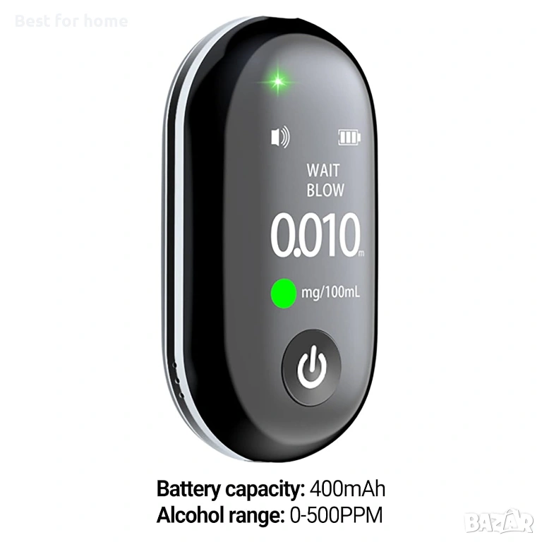 Име на артикула: Тестер за алкохол в дъх Материал: ABS Капацитет на батерията: 400mAh (включена). Комплектът включва: 1 x Тестер за алкохол в дъх 1 x Захранващ кабел.