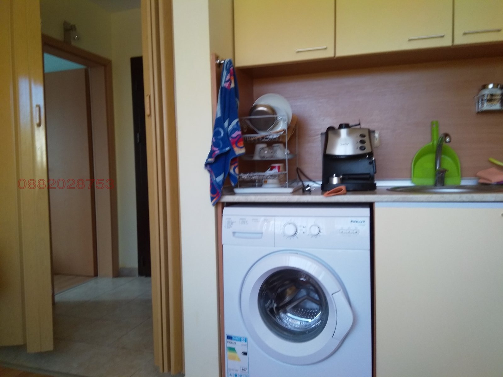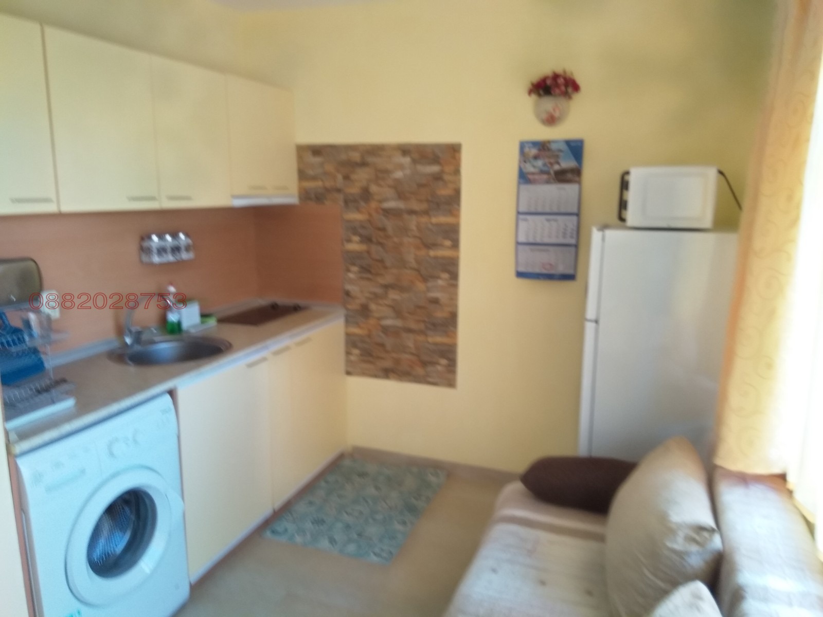 Кухнята е оборудвана с пералня, голям хладилник, вградени котлони, шкафове, посуда, ел.кана, кафе машина, разтегателен диван за двама. Голяма тераса с излаз от двете стаи.