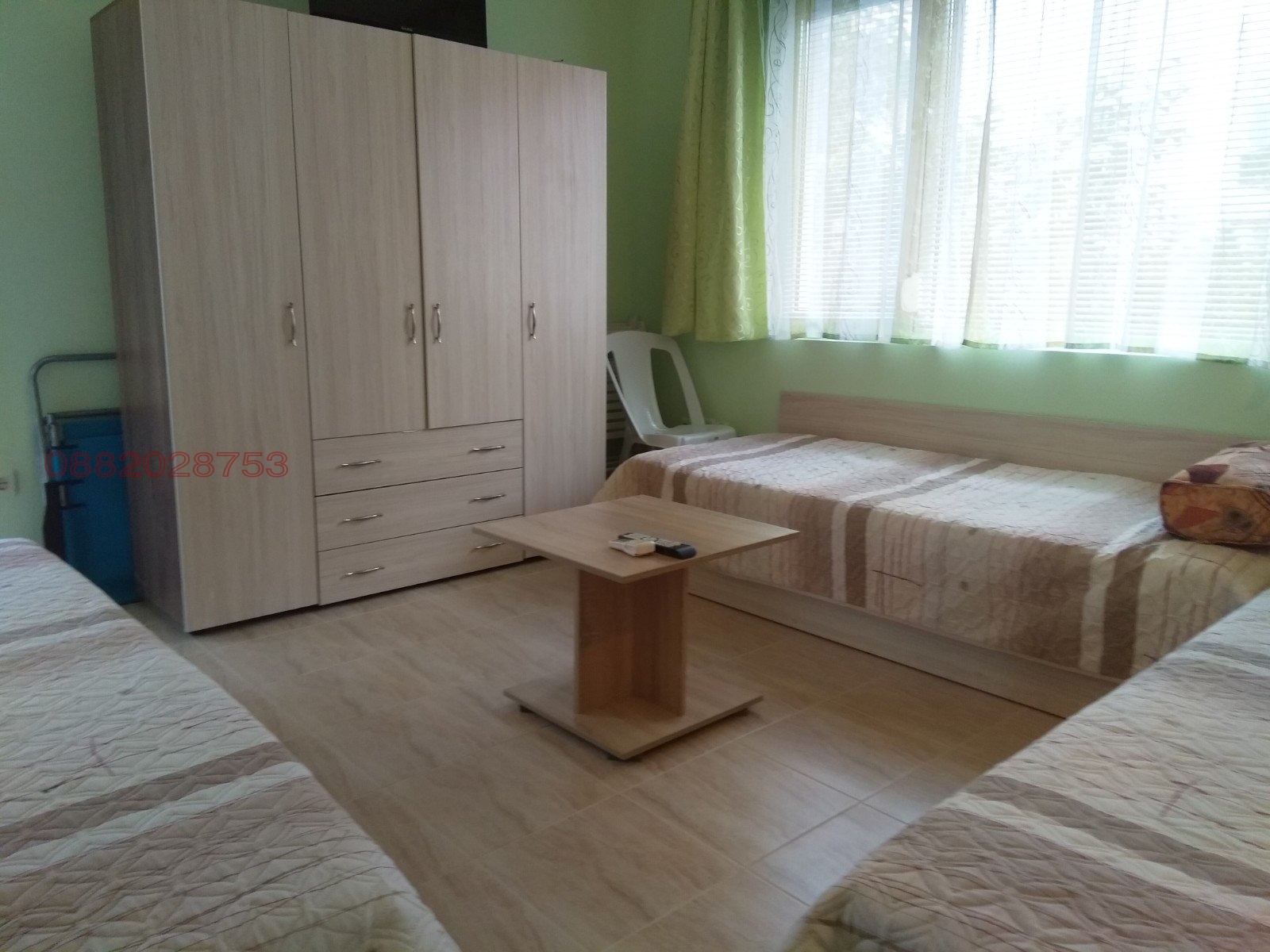 Климатик в стаята, разтегателен диван, 2 ъглови легла, гардероб, хавлии, ютия, дъска за гладене, ракла.