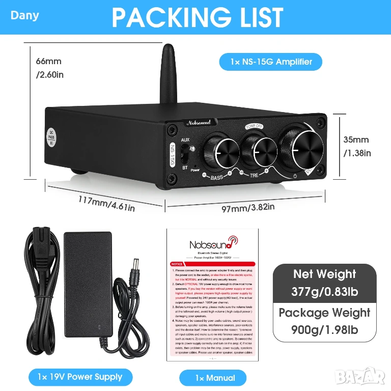 Nobsound NS-15G Mini Bluetooth 5.0 Digital Amplifier Receiver TPA3116 Stereo Audio Amp 100W+100W