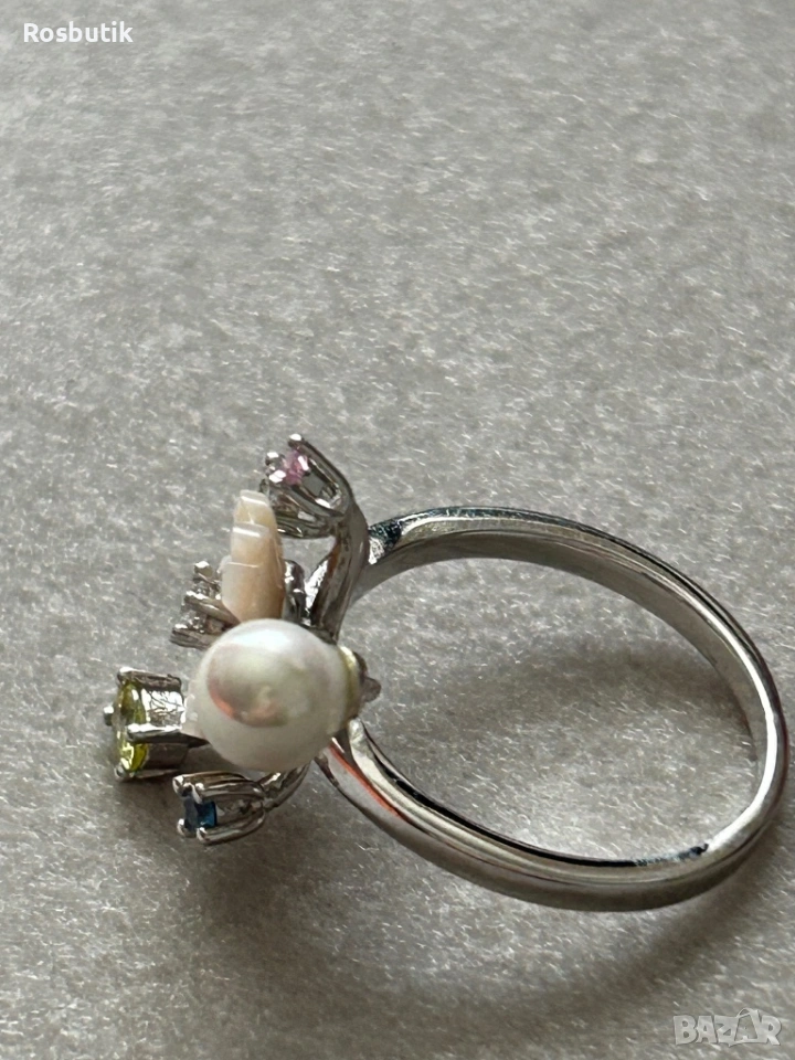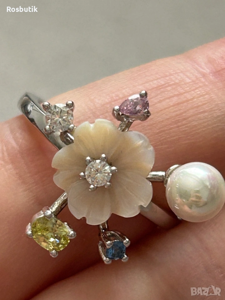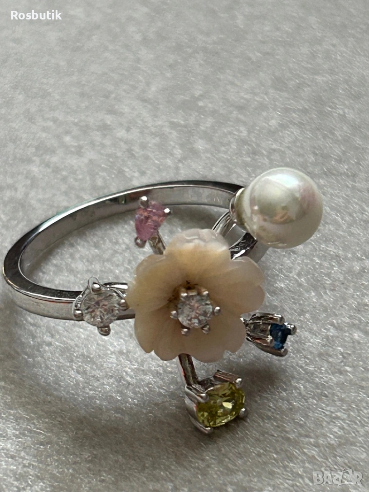 Красив сребърен пръстен със седефено цвете перла и топази → Обява 53259877