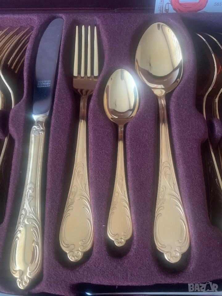 Луксозен комплект прибори за хранене и прибори за сервиране. Комплектът съдържа 60 броя прибори за хранене за 12 човека и 10 броя прибори за сервиране. Всички прибори са с маркировка 23/24 карата твърдо златно покритие и с маркировка Solingen 18/10. Моделът е Виена. Налична е гаранция за качество от производителя.
