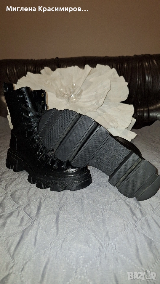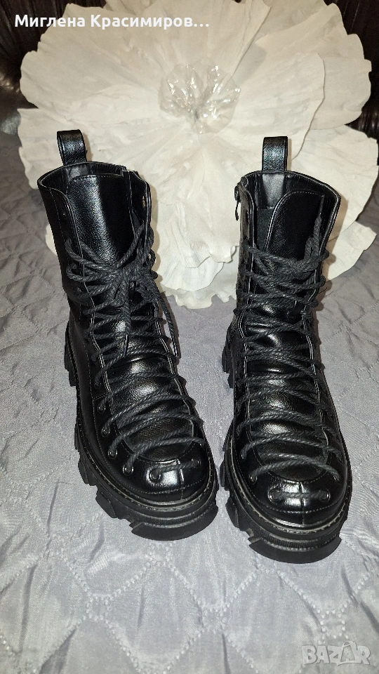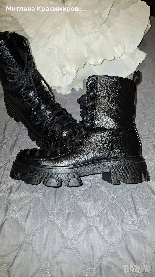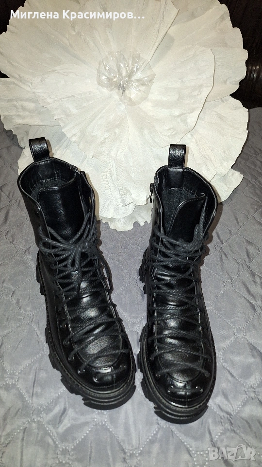 Черни боти,естествена кожа,номер 39(отговарят си).Груба платформа,с цип и връзки.Състояние - отлично.