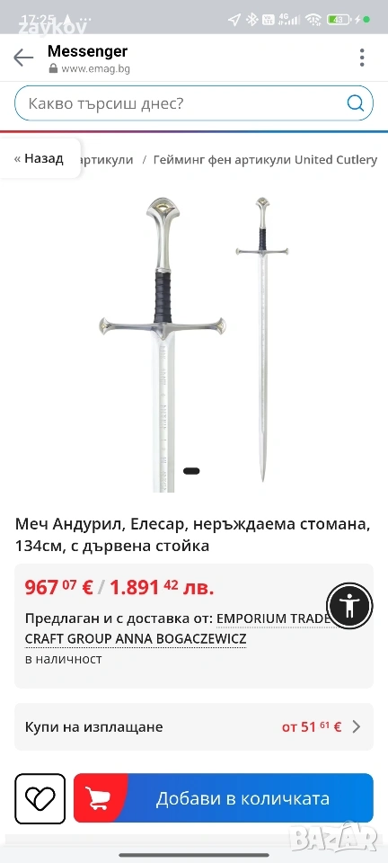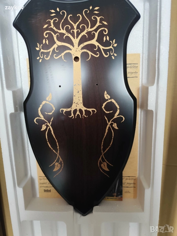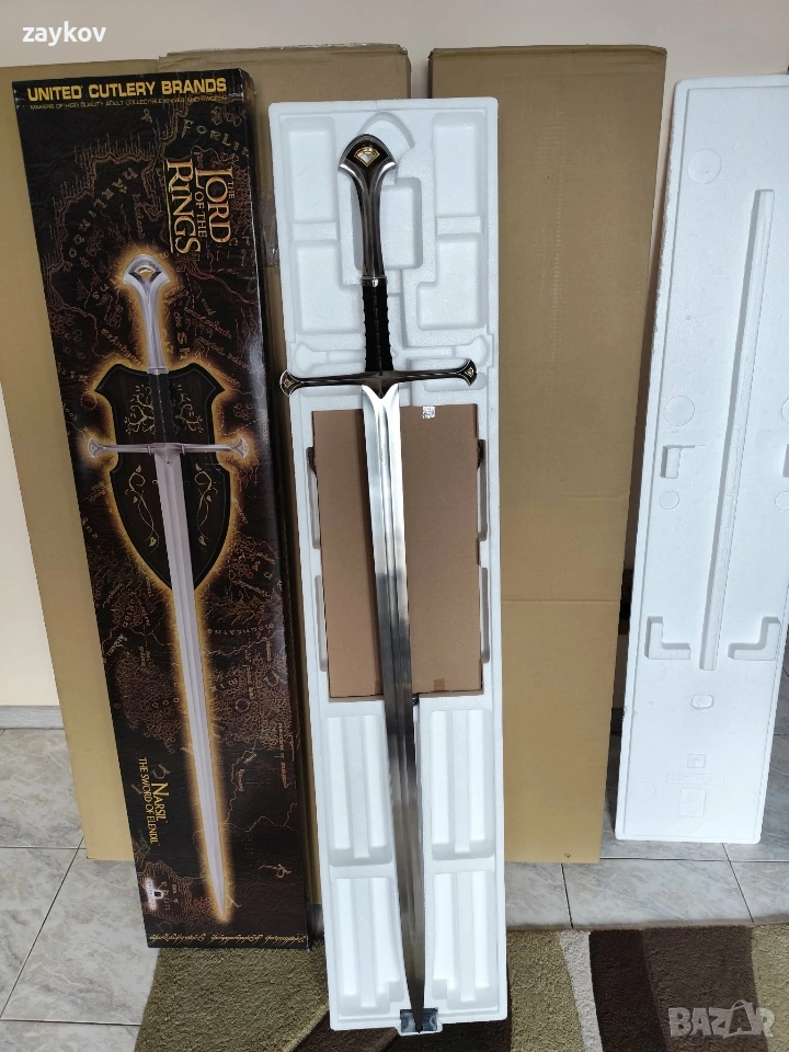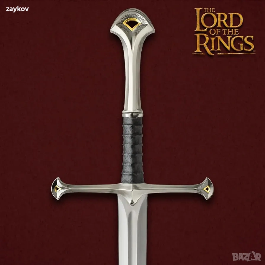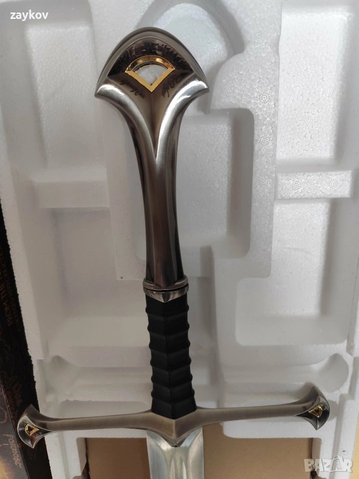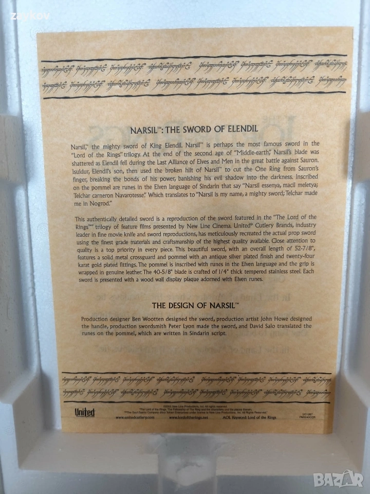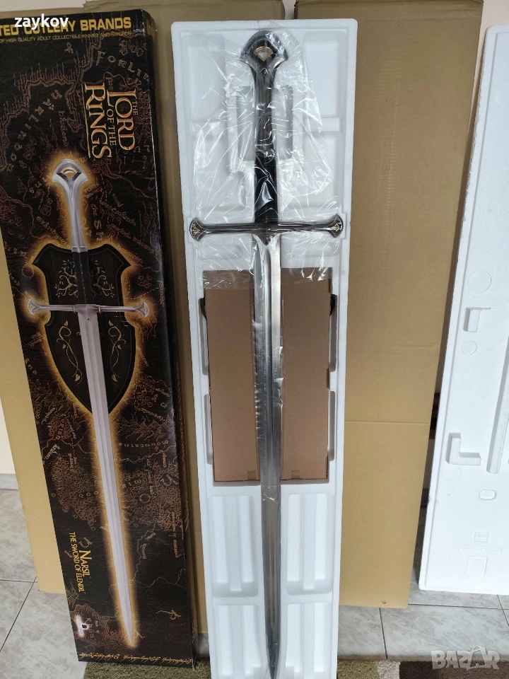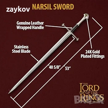 меч е репродукция на Нарсил, известният меч на крал Елендил от трилогията „Властелинът на пръстените“. Нарсил е бил счупен на парчета, когато Елендил се е сражавал срещу тъмния лорд Саурон, а Исилдур е използвал парчето от дръжката на Нарсил, за да отсече Единствения пръстен от ръката на Саурон. Парчетата на Нарсил са били използвани за изковаване на нов меч, Андурил, използван от Арагорн. Тази красива репродукция е с обща дължина 52 инча и разполага с 40-инчово острие от неръждаема стомана AUS-6. Дръжката е обвита с естествена кожа с плътен метален напречен предпазител и дръжка с антично посребрена повърхност и 24-каратово златно покритие. Дръжката е гравирана с руни на елфическия език Синдарин. Тази автентично детайлна реплика е репродукция на действителния филмов реквизит, създаден от Weta Workshop от Нова Зеландия и използван във филмовата трилогия „Властелинът на пръстените“. United Cutlery, лидер в индустрията за качествени филмови репродукции, внимателно е пресъздала реквизита, използвайки най-добрите материали и изработка. Вниманието към детайла е било основен приоритет. Представен е с дървен стенен дисплей и включва сертификат за автентичност. Този меч не е репродукция. Има ограничен брой от тези мечове, останали от първата производствена серия, когато трилогията „Властелинът на пръстените“ е публикувана за първи път. Това е последният ви шанс да притежавате частица от историята на „Властелинът на пръстените“, преди да изчезнат завинаги.