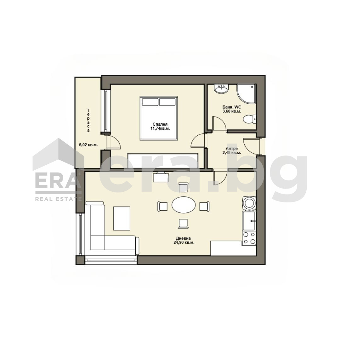 ЕРА Визия предлага за продажба двустаен апартамент, разположен на пети, последен етаж в жилищна сграда в начален етап на строителство, в кв.'Владиславово'. Имотът е с площ 67.3кв.м (с общите части), 56,3 кв.м (застроена площ), разпределени по следния начин: коридор (2,48 кв.м), всекидневна с кухненски бокс (25,05 кв.м), спалня (11,76 кв.м), баня с WC (3,60 кв.м), тераса с излаз от двете стаи (5,40 кв.м), ведно с прилежащо избено помещение (2,35 кв.м). Изложение: юг/запад.
