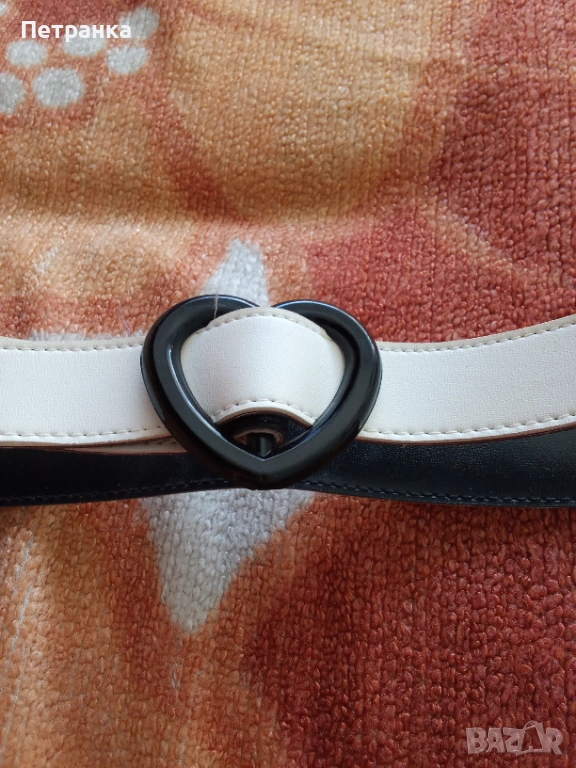 Снимка 3 - естествена кожа, черно и бяло с пластмасова катарама във формата на сърце.