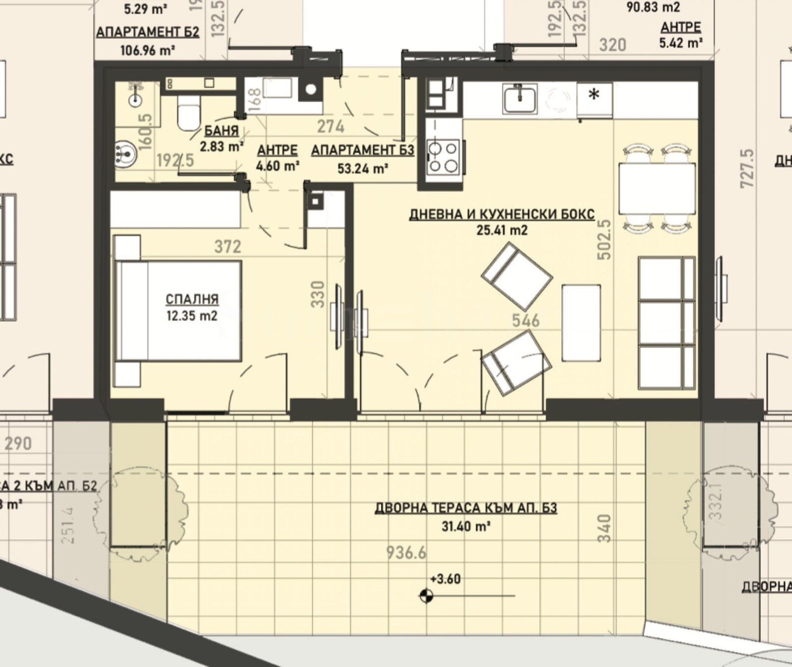Просторният апартамент е разположен на първи етаж в сграда Б и има обща площ 59,81 кв.м, чиста площ 53,24 кв.м, както и собствен двор от 31,40 кв.м. Изложението е изцяло южно. Жилището се предлага в степен на завършеност по БДС, с газово отопление с подово отопление и изводи за климатици. Състои се от антре, баня/тоалетна, дневна с кухня и трапезария, една спалня, дворна тераса с излаз от двете стаи.