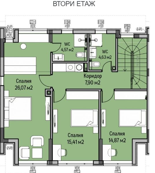 Втори етаж: три спални, две бани, гардеробно помещение към основната спалня.