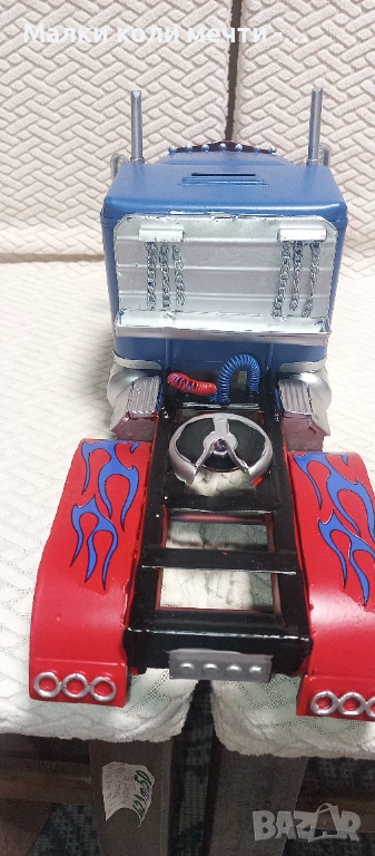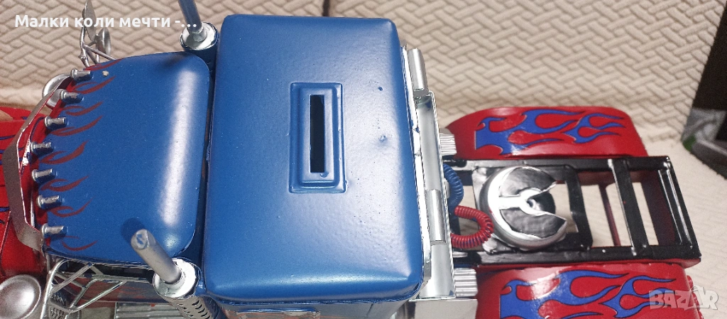 ръчно изработен камион от ковано желязо , дължина 44 см , широк 15 см и височина 18 см , има опция за използване и като касичка . Колелцата се въртят . Малка забележка е ,че при заварката е останал малко парченце метал вътре и при разклащане дрънчи :) . Цена 60 евро.