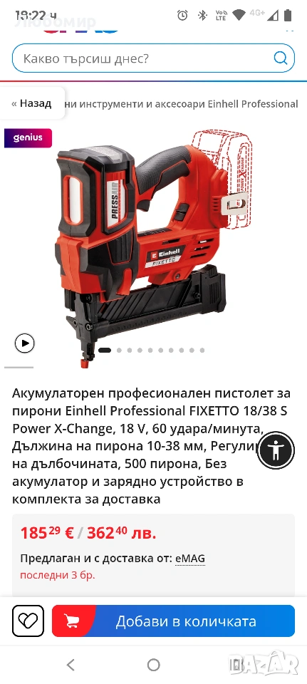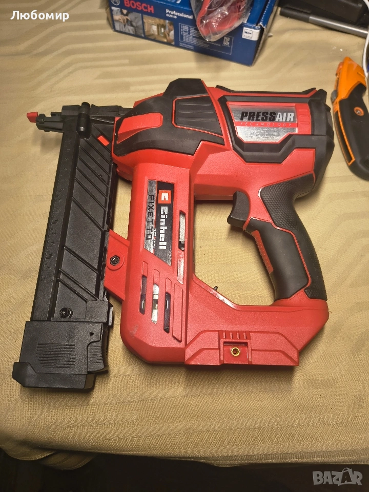 Работа - Телбодът стои удобно в ръката благодарение на меката дръжка. Предпазният нос предпазва от нежелано задействане, а два светодиодаАкумулаторен професионален пистолет за пирони Einhell Professional FIXETTO 18/38 S Power X-Change, 18 V, 60 удара/минута, Дължина на пирона 10-38 мм, Регулиране на дълбочината, 500 пирона, Без акумулатор и зарядно устройство в комплекта за доставка осигуряват оптимална видимост.