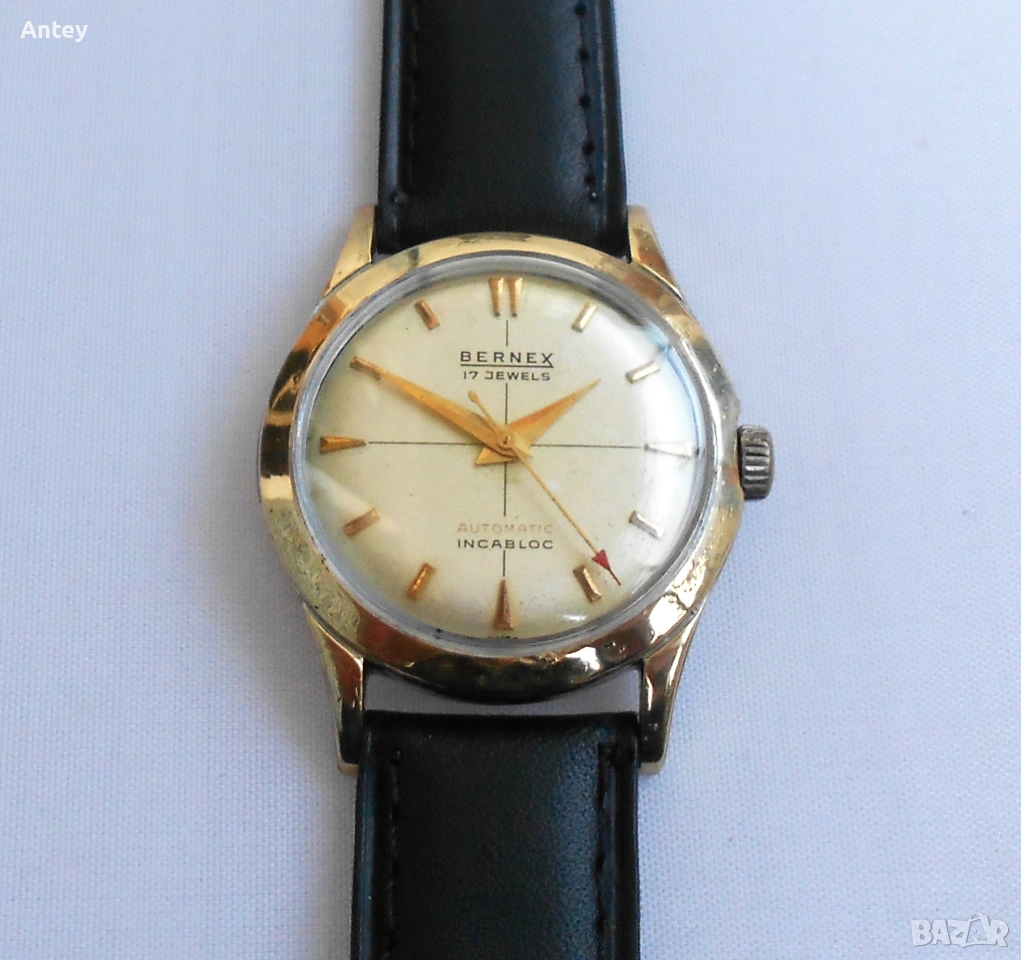 Швейцарски механичен часовник в отлично състояние. 34 мм. позлатeна каса, много добре запазена. Оригинален циферблат със златисти стрелки и двуцветни контрастни маркери. Ново стъкло. Механизмът AS 1790 работи нормално и поддържа точно време.