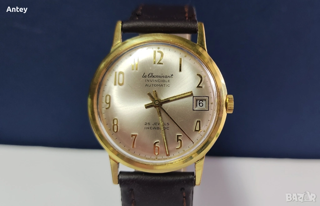 Швейцарски часовник с ръчно и автоматично навиване, в отлично състояние. 35 мм. хромирана каса, много добре запазена. Оригинален циферблат в цвят „шампанско“, със златисти стрелки и маркери. Оригинално чисто стъкло. Механизмът ЕТА 2451 работи нормално