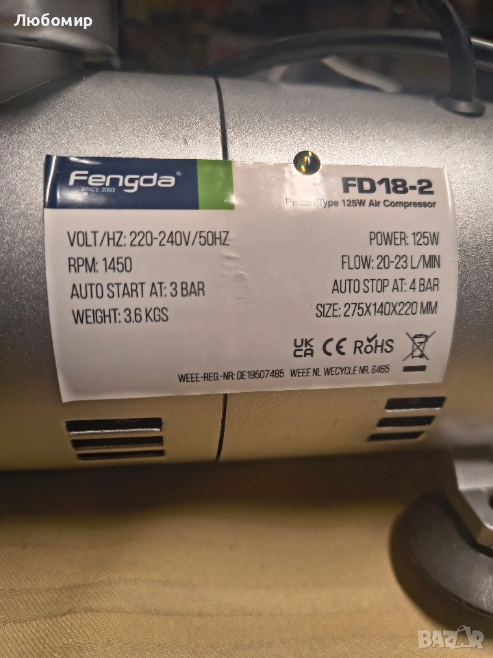 Мострен без опаковка липсва едното краче .Ниска сила на звука по време на работа, може да се използва и вечер у дома. Благодарение на ниското си тегло, той е преносим и подходящ за домашна и хоби употреба. Този компресор се използва често. Този компресор е подходящ за