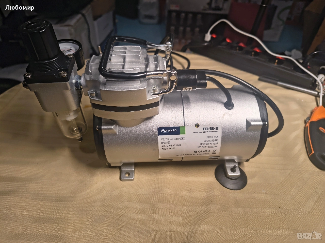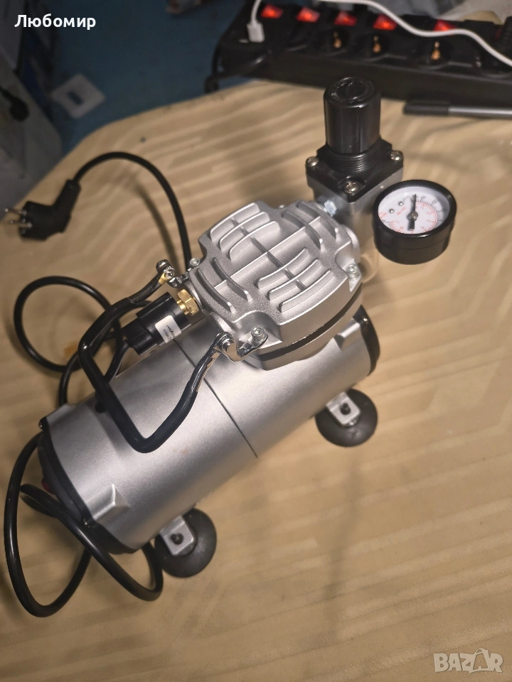 аерографи с дюзи от 0,2 до 1 мм. Пакетът включва: 1x компресор без съд под налягане 1x регулатор на изходното налягане, с филтър и манометър 1x захранващ кабел 1x Инструкции Мини компресорът се използва за: Аерограф, козметични, маникюрни и тату студия (салони), хоби и домашна употреба Технически спецификации: Еднобутален, безмаслен мини компресор, подходящ за аерограф пистолети с дюза 0,2 мм-1 мм и регулатор на изходното налягане (с филтър и манометър) Информация за регулатора на налягане: 0-7 kgf / cm2 (0-100 PSI) Предпазен / изпускателен клапан Топлинна защита Ухо за предаване на компресори 4 противоплъзгащи Напрежение: 220-240 V / 50 Hz Мощност: 0,123 kW (1/6 к.с.) Скорост: 1450/1700 об/мин Сила на звука: 47 dB / 1 м Дебит: 20 - 23 л/мин без товар Тегло: 3,32 кг Размери (обем): 25,5 x 20,6 x 13,5 см Въздушна връзка: завинтване G 1 / 8- Дължина на кабела: 1,9 м Сертификати: CE, GS, ETL, CETL, ROHS Регулируемо налягане: от 0 бара до 4 бара Еднослоен превключвател Автоматично стартиране от 3 бара (43 PSI) Автоматично изключване при 4 бара (57 PSI)