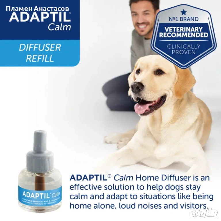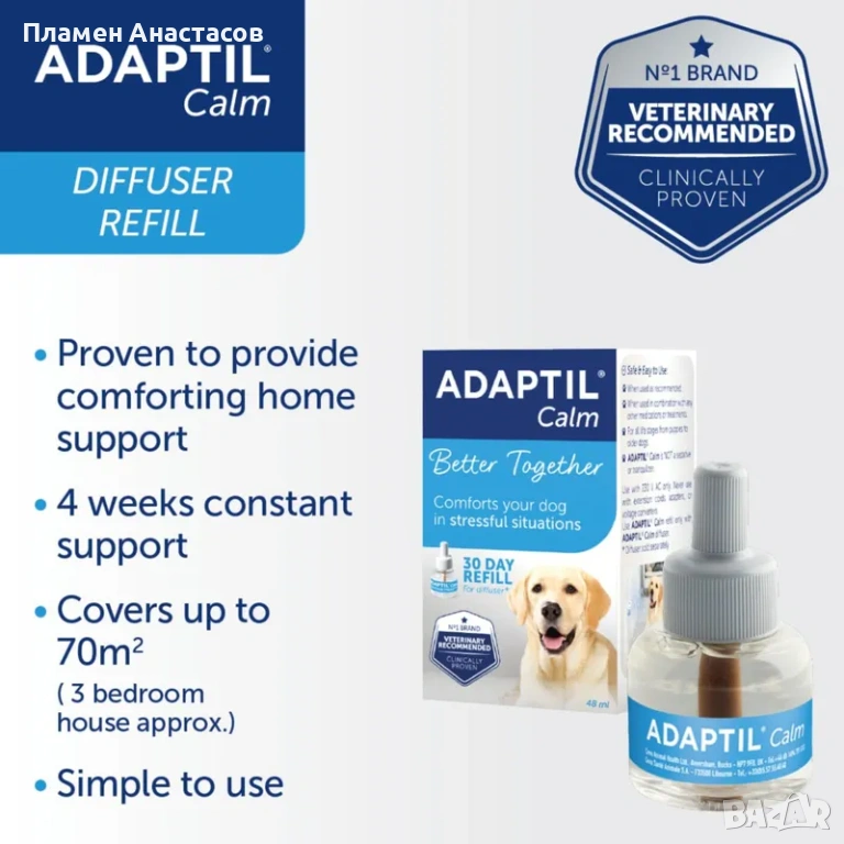 Adaptil Refill 3-Pack е комплект от три пълнителя за дифузер Adaptil, създадени да намаляват стреса и тревожността при кучета в домашна среда. Формулата с успокояващи феромони помага на домашния любимец да се чувства по-спокоен и защитен при оставане сам вкъщи, силни шумове, пътувания, гости или други стресови ситуации.