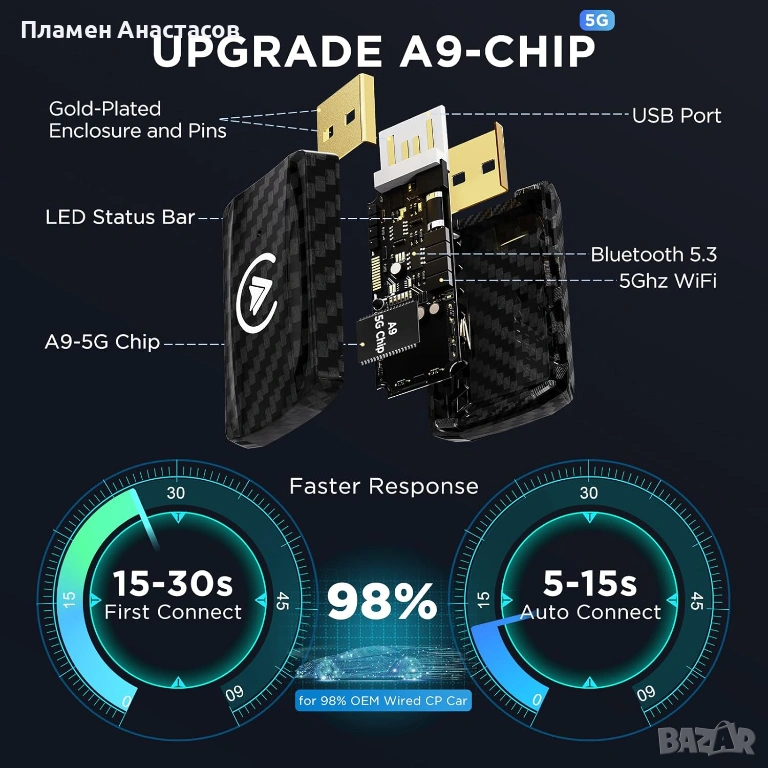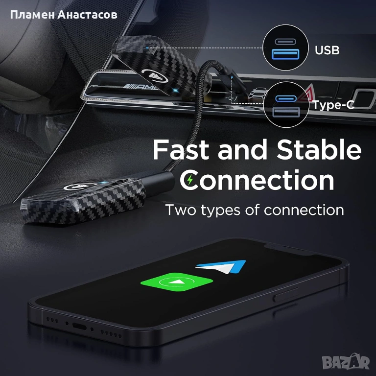 MSXTTLY AC01 е компактен 2-в-1 адаптер, който превръща стандартния кабелен CarPlay или Android Auto в безжична връзка. Позволява автоматично и бързо свързване на смартфона към мултимедията на автомобила без нужда от кабели, за по-удобно и безопасно шофиране.