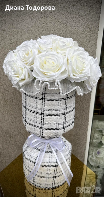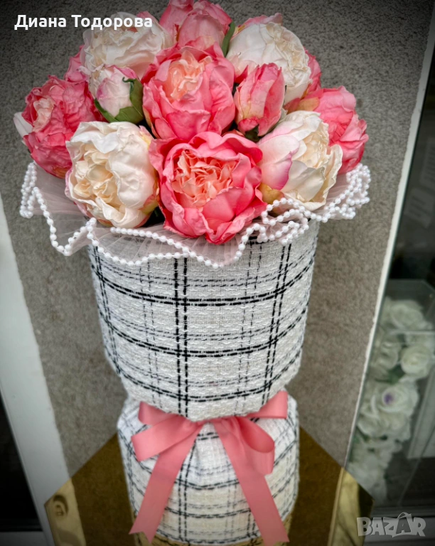 изкуствени рози в дизайнерска текстилна опаковка от фино букле, подходяща за официални и специални поводи. Размери : ширина 55 см, височина 33 см.
