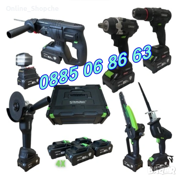 Комплект 7 в 1 от акумулаторен перфоратор, винтоверт, гайковерт, ъглошлайф, саблен трион, верижен трион с омасляване и LED лампа 36V 10Ah - с 4 батерии и 30 части в куфар StahlMayer Black XR