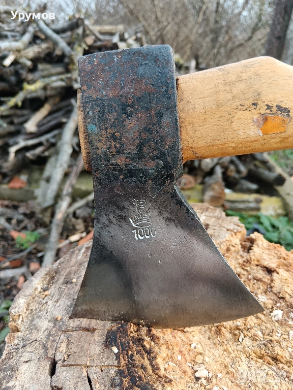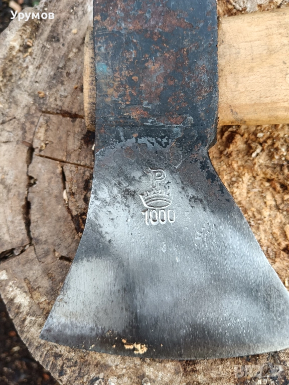 Топор „Gebr. Pandel" 1000g. Брадвата е в отлично състояние, здрава, без заварки и спуквания. Отлично острие със ясна маркировка P и корона. Оригинална дръжка със запазен лак