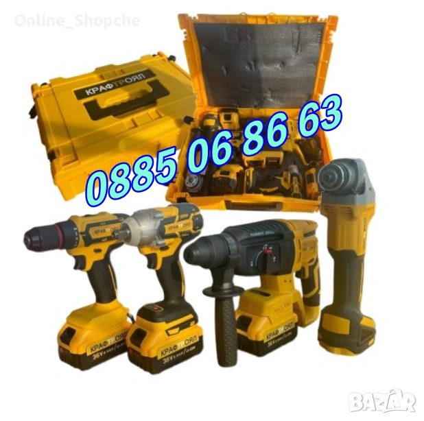 Комплект 4 в 1 от акумулаторен перфоратор, ъглошлайф 125 мм, гайковерт и винтоверт 36V 8Ah с 3 броя батерии в куфар KraftRoyal