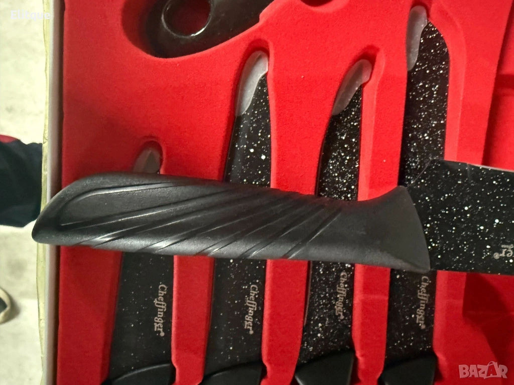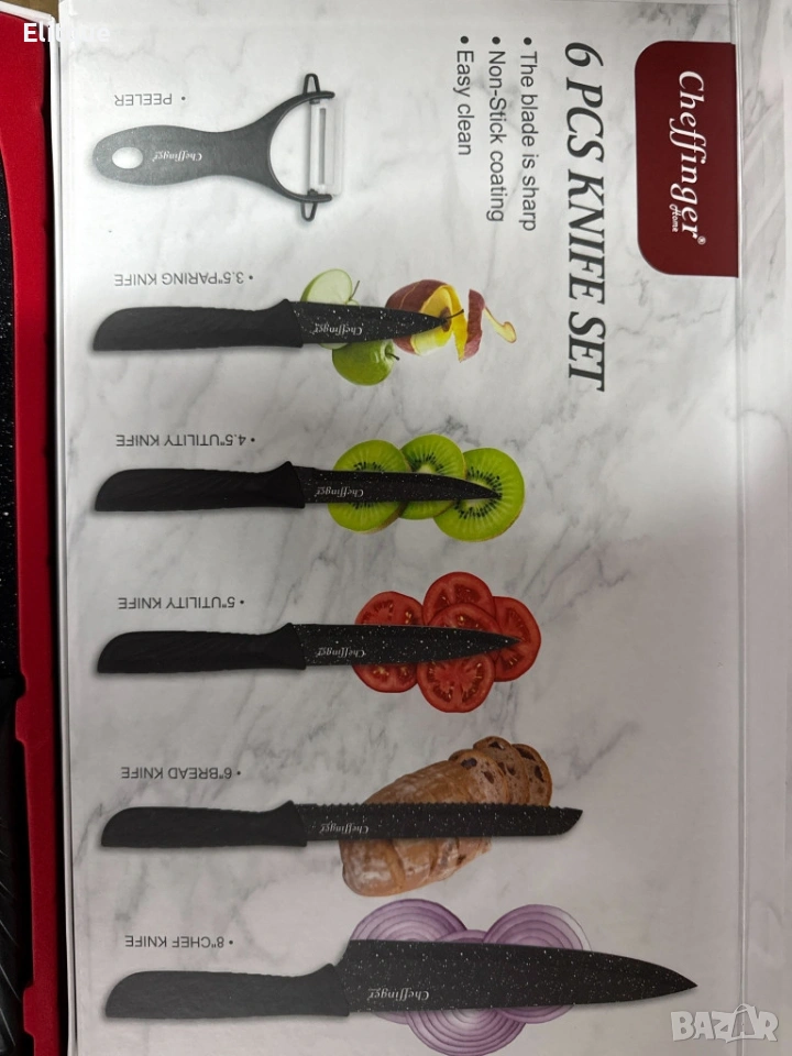 Комплектът включва: Готварски н о ж – 20 см; Н о ж за хляб – 16 см; Универсален н о ж – 13 см; Н о ж за обезкостяване – 12 см; Н о ж за белене – 9,5 см; Белачка; Поддръжка / почистване: лесно ръчно измиване; Допълнителни функции: магнитна подаръчна кутия; Безопасност: подходящи за домашна употреба и контакт с храна.