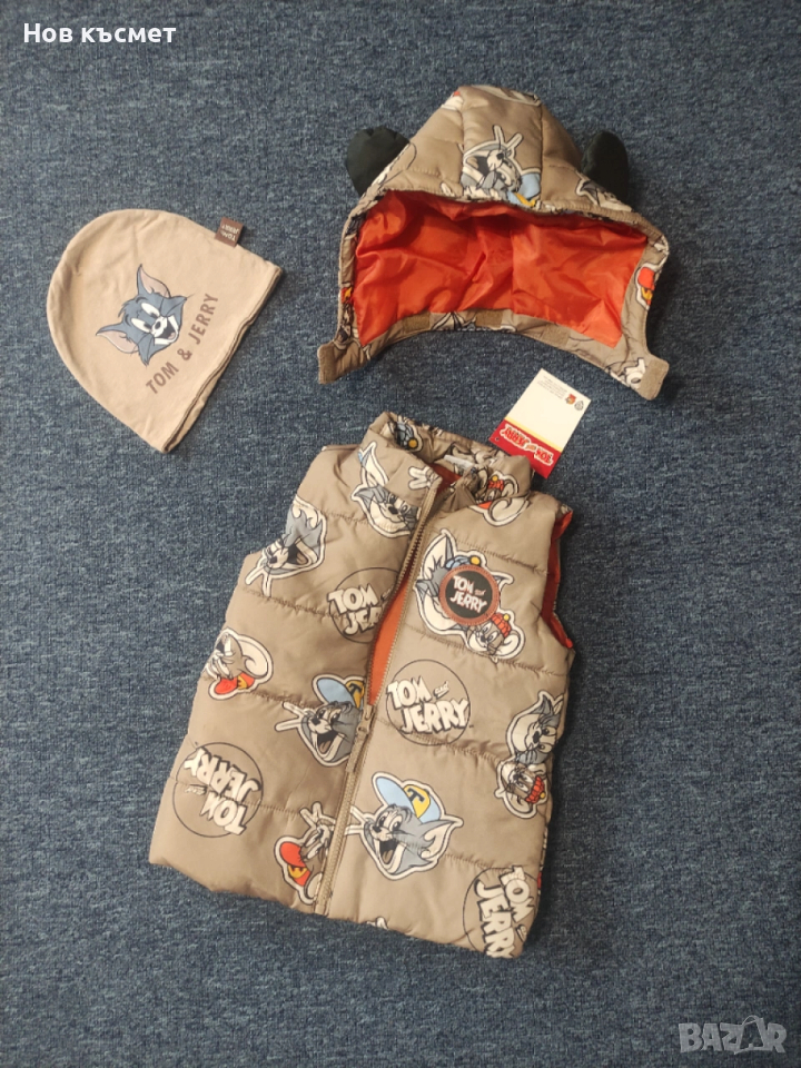 Пухен елек с цялостен принт Том и Джери, със сваляща се качулка, два странични джоба. Нов, с етикет!