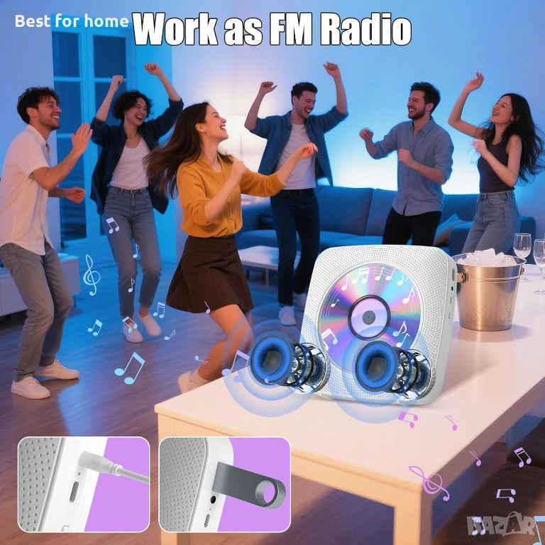 CD плейър „всичко в едно“: Този CD плейър Gueray има Bluetooth Hi-Fi високоговорител, FM радио, USB флаш устройство и функция за 3,5 мм аудио плейър. Поддържа също широка гама от CD формати, включително CD, CD-R, CD-RW, CD-MP3 и CD-WMA. Вграденото FM радио покрива честотния диапазон от 76MHz до 108.0MHz, предоставяйки ви разнообразие от опции за слушане. Независимо дали сте у дома или в движение, този CD плейър „всичко в едно“ има всичко необходимо за едно завладяващо аудио изживяване.
