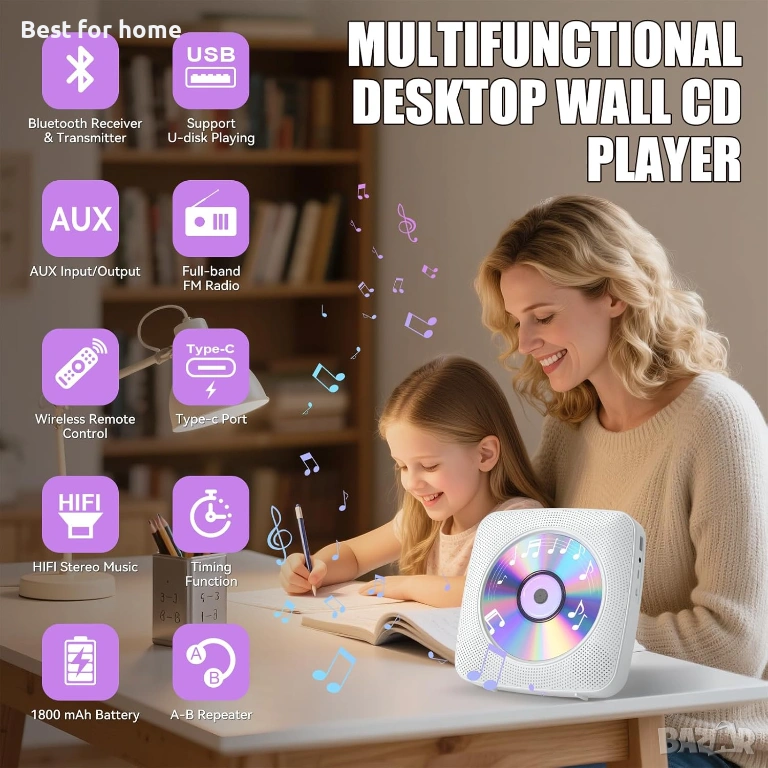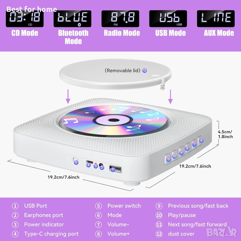 Дизайн за настолни компютри и стени: CD плейърът е проектиран за лесно поставяне и се предлага със стойка за бюро за лесно поставяне на маси или бюра. Може да се монтира и на стена, за да се спести място, а подвижният капак за прах предотвратява натрупването на прах, осигурявайки оптимално CD възпроизвеждане. Иновативният дизайн не само подобрява естетическата привлекателност, но и предоставя практически предимства, а гъвкавостта при опциите за поставяне го прави чудесно допълнение към всяка стая във вашия дом.