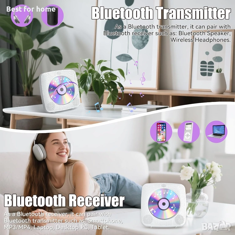 Bluetooth предавател и приемник: Оборудван с Bluetooth 5.0, този CD плейър може да се свързва с Bluetooth устройства, като мобилни телефони или таблети, когато се използва като Bluetooth Hi-Fi високоговорител. Също така се свързва с Bluetooth слушалки, осигурявайки зона на свързване от 10 метра. Тази двойна функционалност ви позволява да се наслаждавате на любимата си музика безжично, независимо дали стриймвате от телефона си или слушате чрез висококачествени Bluetooth слушалки.