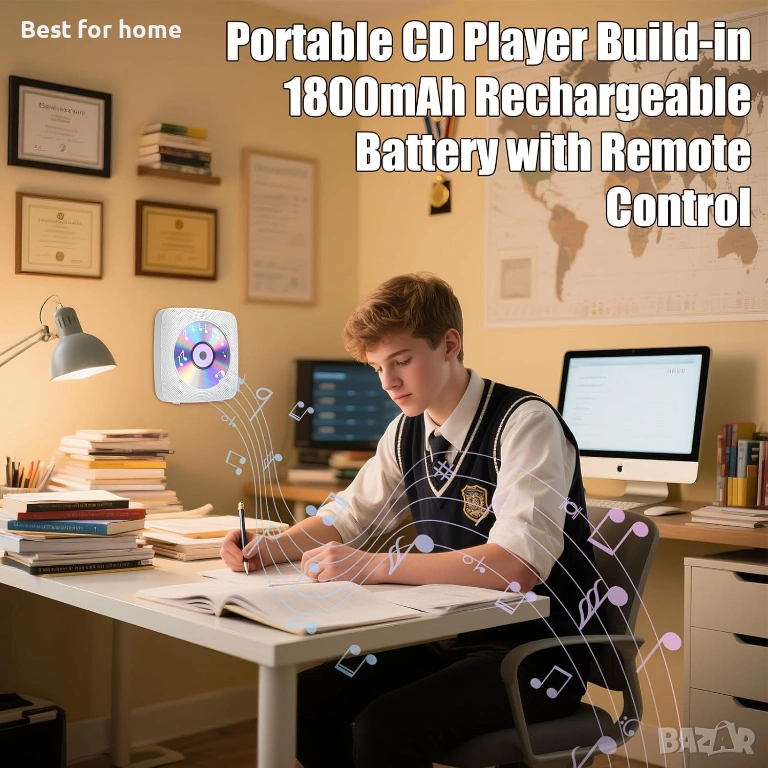 CD плейър Gueray с Bluetooth, за стенен монтаж, CD музикални плейъри, работещи с батерии за дома, с високоговорители, 1800mAh акумулаторен LCD екран, FM радио, USB AUX жак, дистанционно управление.