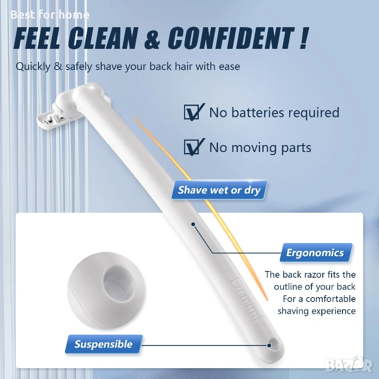 Самобръсначки за гръб Durimi за мъже: Самобръсначка за гръб „Направи си сам“ за мъже с технология за безопасно острие и ергономична дръжка, за мокро или сухо бръснене.