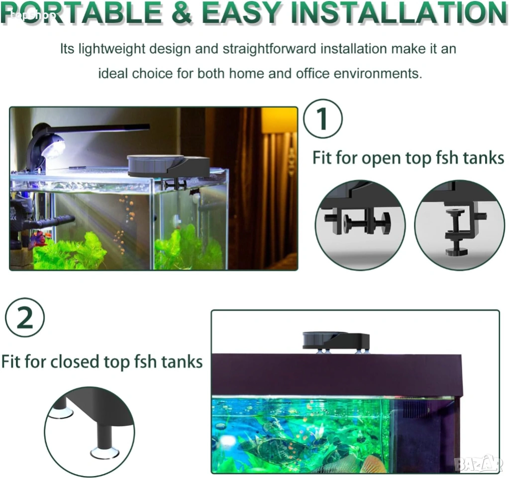 Компактен дизайн: Подходяща както за малки домашни аквариуми, така и за офис декорации.
