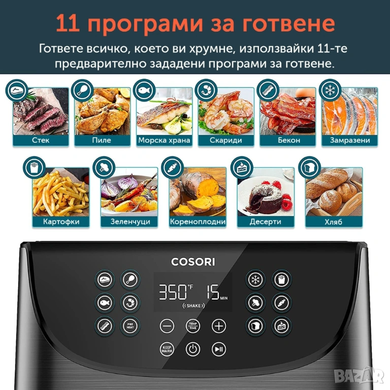 Програмите на Cosori ви дават възможност за предварителни настройки, разработени специално от майстор-готвачите на Cosori, което гарантира запомнящ се вкус на ястията. Функциите за запазване на температурата в уреда и предварително загряване, ви осигуряват изживяване в кухнята от нова висота.